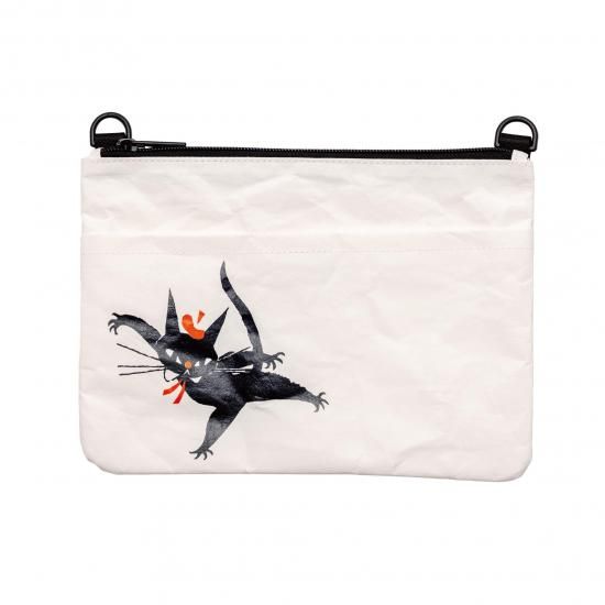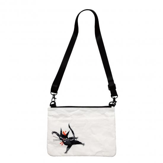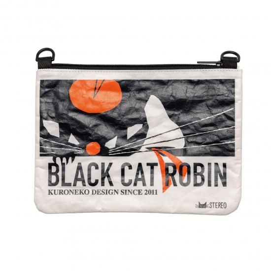 ろびんちゃんの3ポーズとアップの2タイプ。財布やサングラスなども入るお散歩に最適なサイズ。外ポケット付きで、ストラップの長さ調整可能。ホワイトとブラックの2色展開。